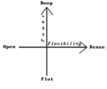 Adaptation (immunization) encloses flow in an intricate cocoon of rules, cushioning it and increasing its flexibility. Evolution (mediation) erects a hierarchy of rules connected by power. It should by now be obvious that the two processes are not opposed, but complementary. A system may be powerful but also flexible, it may be flexible but not powerful, etc.. We may therefore envision evolution and adaptation as two intersecting axes of variation and change. Each of the four points of the cross they form denotes an extreme state to which a texture may be driven by adaptation or evolution: On a macro-level, evolution proceeds from "primitive" to "modern" systems. But since mediation is just as relevant on a micro-level I shall avoid the traditional terms and refer to an evolved texture with an extensive hierarchy of rules as "deep", its opposite as "flat". A flexible, well-adapted texture is crisscrossed by multiple rules and will therefore be denoted "dense", while mal-adaption and inflexibility is "open". (Figure 1.)